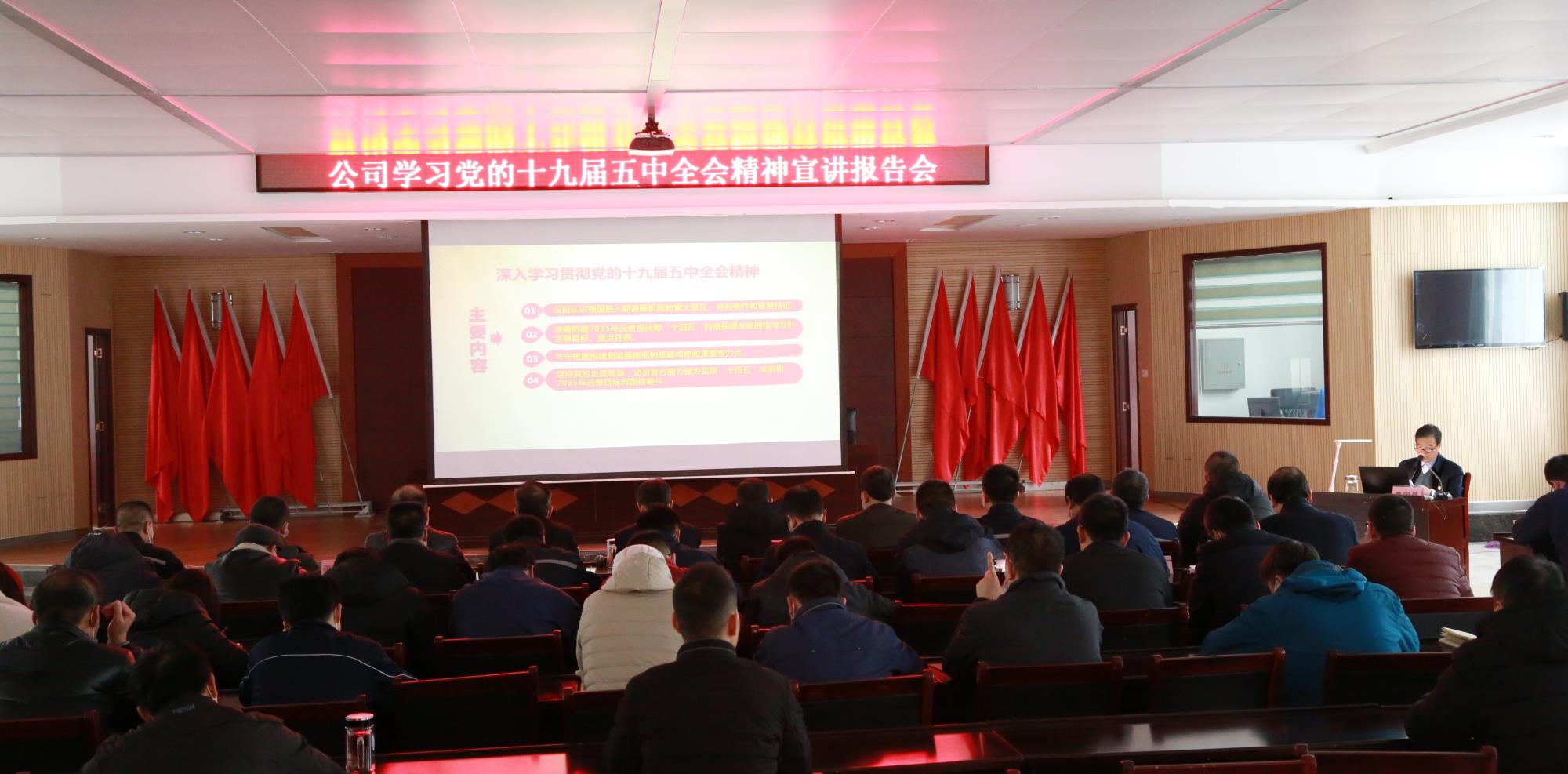 學(xué)習(xí)好、宣傳好、貫徹好黨的十九屆五中全會(huì)精神,是各級(jí)黨組織和黨員干部當(dāng)前和今后一個(gè)時(shí)期的重要政治任務(wù)。12月8日下午,鉛硐山礦業(yè)、旺峪礦業(yè)公司黨委認(rèn)真貫徹落實(shí)集團(tuán)公司黨委安排部署,在公司教培中心舉行學(xué)習(xí)黨的十九屆五中全會(huì)精神專(zhuān)場(chǎng)宣講會(huì),由集團(tuán)公司宣講團(tuán)成員,公司黨委書(shū)記、董事長(zhǎng)秦寧昌主講。公司領(lǐng)導(dǎo)班子成員、中層干部、機(jī)關(guān)黨員及銀母寺(阿克陶廣新)礦業(yè)黨員干部80余人參加聽(tīng)講學(xué)習(xí)。公司黨委副書(shū)記、總經(jīng)理毛有平主持宣講會(huì)。