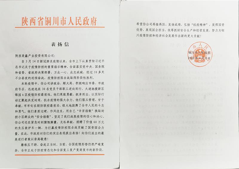 4月上旬,銅川市人民政府向陜西美鑫公司發(fā)來一封《表揚信》,對該公司積極參與銅川市3.14疫情防控工作付出的努力和做出的貢獻表示高度的贊揚,對主動擔當、勇于作為,防疫情、穩(wěn)生產(chǎn)取得的成績給予充分肯定。