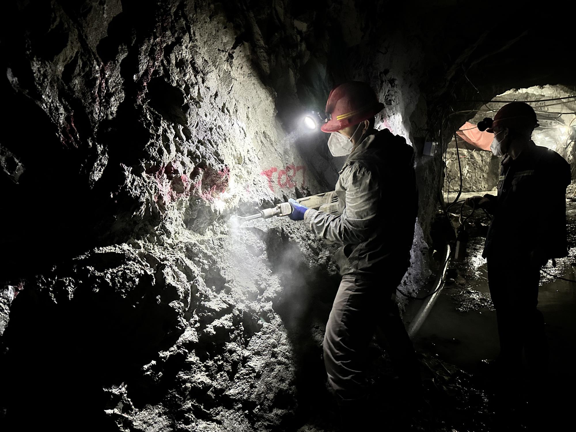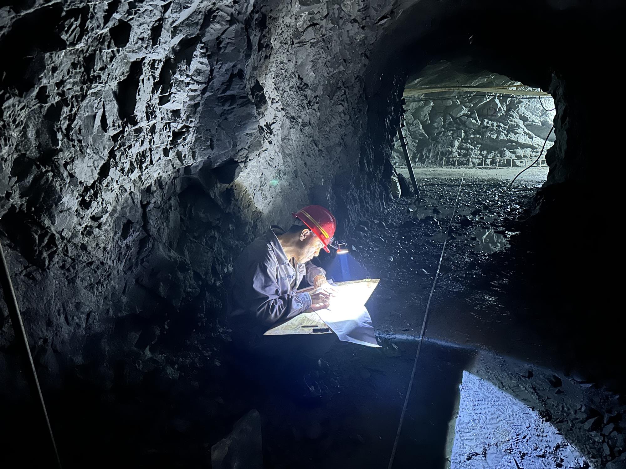 山陽(yáng)縱橫礦業(yè)的地質(zhì)技術(shù)服務(wù)合同還未敲定,但礦山生產(chǎn)不能等。這一周成了與時(shí)間的搶奪戰(zhàn),每日晨光稀薄時(shí),頭燈便已劃破礦井幽深的黑暗。地下分不清晝夜,只有巖壁滲水單調(diào)的滴答聲作伴。我們弓身在水汽彌漫的巷道里穿行,好不容易找到片稍干爽的地方,剛攤開素描紙,水痕又暈染了墨線。我們的地質(zhì)編錄工作常與坑道施工“撞車”,遠(yuǎn)處不時(shí)傳來(lái)悶雷般的爆破聲,震得心口發(fā)麻,防塵口罩混著水汽堵在鼻腔,讓人更加煩躁。