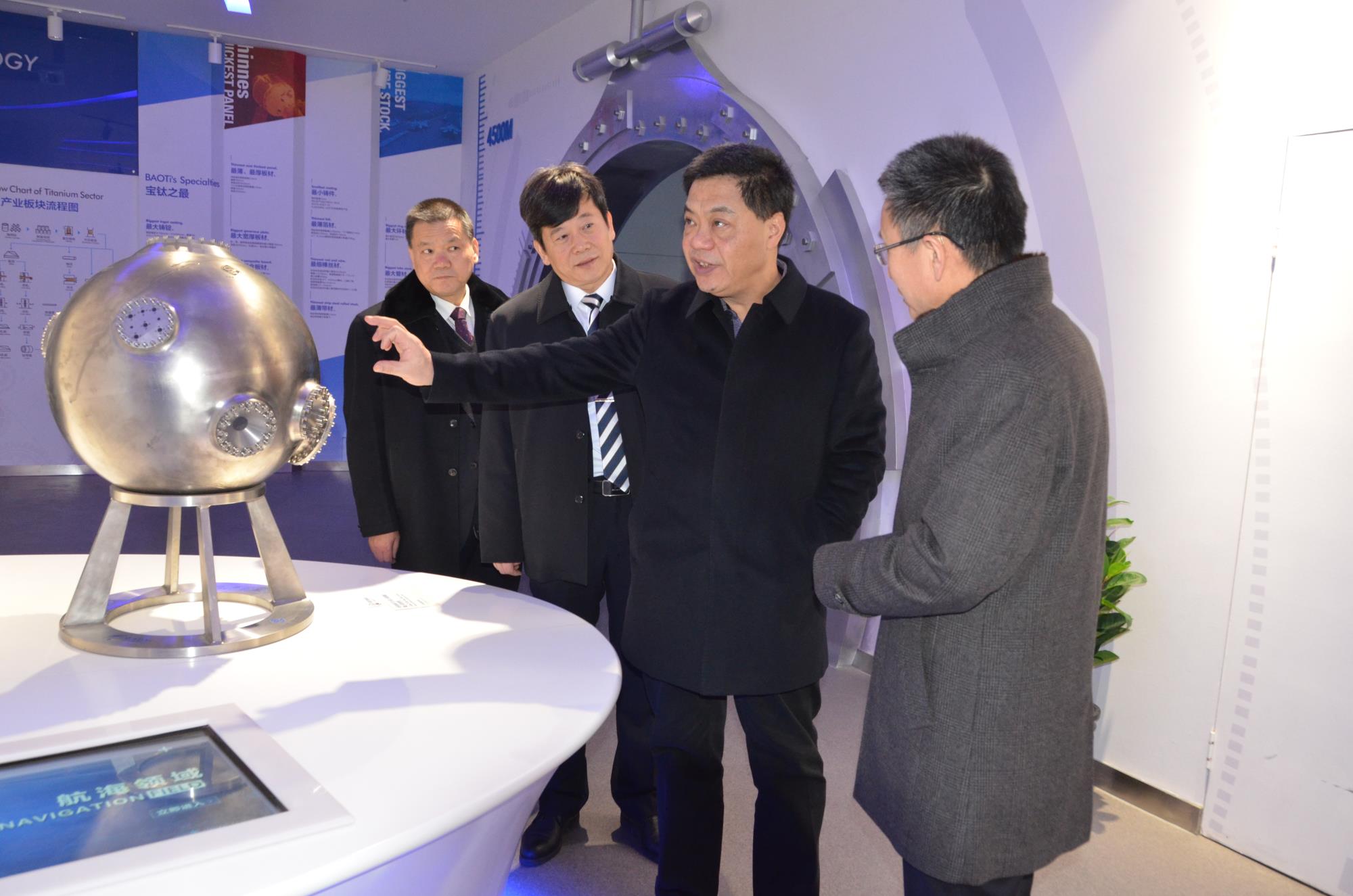 陜西有色金屬集團黨委書記、董事長馬寶平(左三)到寶鈦集團指導科技創(chuàng)新工作。