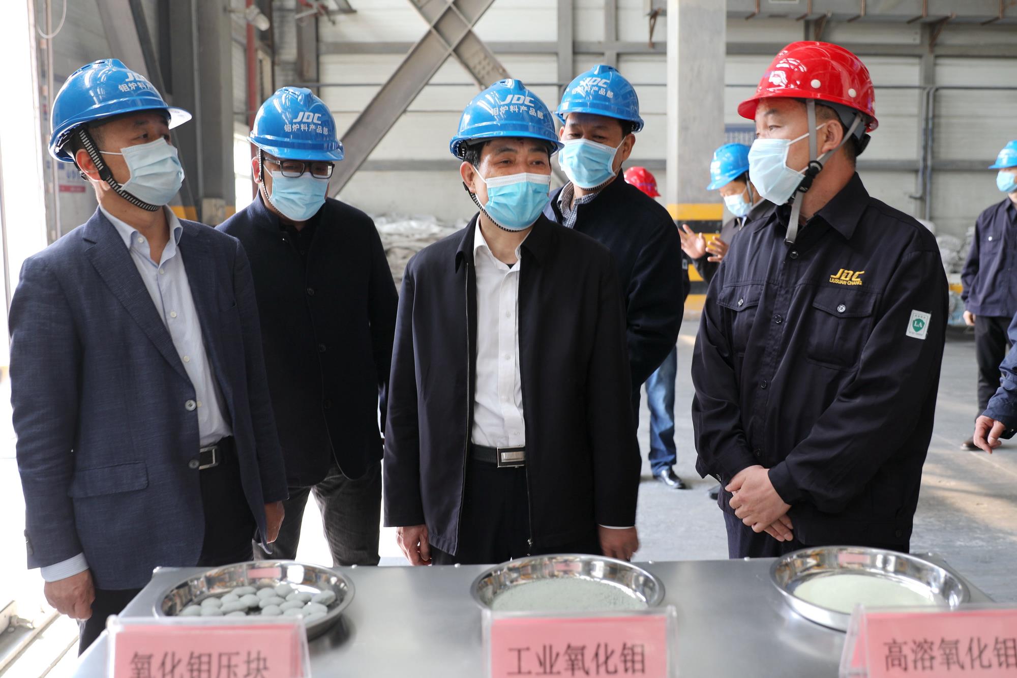 陜西有色金屬集團黨委副書記、總經(jīng)理鄒武裝(左三)到金鉬集團指導復工復產(chǎn)工作。