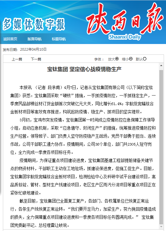 截至目前,寶鈦集團(tuán)已全面復(fù)工復(fù)產(chǎn),各部門、各權(quán)屬單位已恢復(fù)正常運(yùn)行,各條生產(chǎn)線恢復(fù)正常運(yùn)轉(zhuǎn)?!拔覀円_足馬力,加緊生產(chǎn),努力挽回疫情造成的損失,全力保障重點(diǎn)項(xiàng)目建設(shè)進(jìn)度和一季度各項(xiàng)目標(biāo)任務(wù)圓滿完成?!?寶鈦集團(tuán)黨委副書記、總經(jīng)理雷讓岐說。