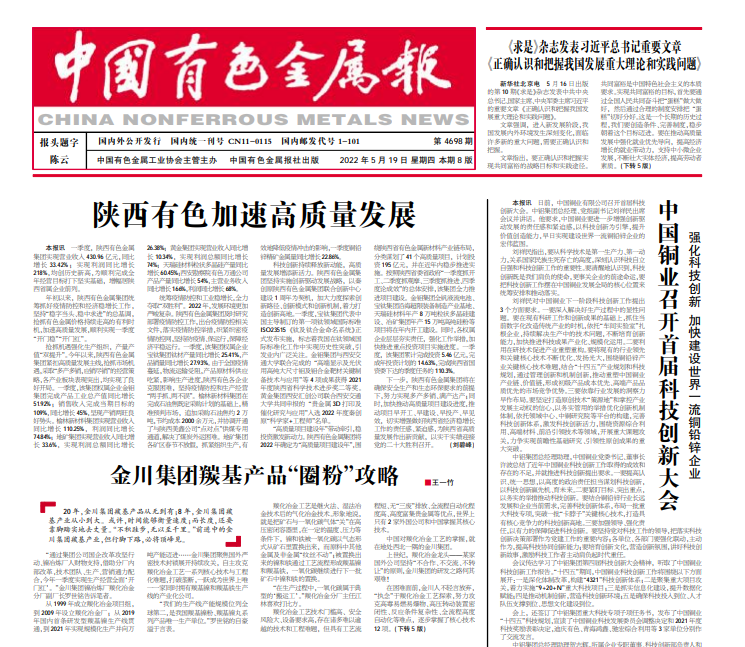 科技創(chuàng)新持續(xù)釋放新動(dòng)能,高質(zhì)量發(fā)展增添新活力。陜西有色金屬集團(tuán)堅(jiān)持實(shí)施創(chuàng)新驅(qū)動(dòng)發(fā)展戰(zhàn)略,以秦創(chuàng)原陜西有色金屬集團(tuán)聯(lián)合創(chuàng)新中心建設(shè)1周年為契機(jī),加大力度探索創(chuàng)新路徑、創(chuàng)新模式和創(chuàng)新機(jī)制,著力打造創(chuàng)新高地。一季度,寶鈦集團(tuán)代表中國(guó)主導(dǎo)制訂的第一項(xiàng)鈦領(lǐng)域國(guó)際標(biāo)準(zhǔn)ISO23515《鈦及鈦合金命名系統(tǒng)》正式發(fā)布實(shí)施,標(biāo)志著我國(guó)在鈦領(lǐng)域國(guó)際標(biāo)準(zhǔn)化工作中實(shí)現(xiàn)歷史性突破,引發(fā)業(yè)內(nèi)廣泛關(guān)注。金鉬集團(tuán)與西安交通大學(xué)聯(lián)合完成的“高端顯示及光伏用高純大尺寸鉬及鉬合金靶材關(guān)鍵制備技術(shù)與應(yīng)用”等4項(xiàng)成果獲得2021年度陜西省科學(xué)技術(shù)進(jìn)步獎(jiǎng)二等獎(jiǎng)。黃金集團(tuán)西安匯創(chuàng)公司聯(lián)合西安交通大學(xué)共同申報(bào)的“貴金屬3D打印及催化研究與應(yīng)用”入選2022年度秦創(chuàng)原“科學(xué)家+工程師”名單。