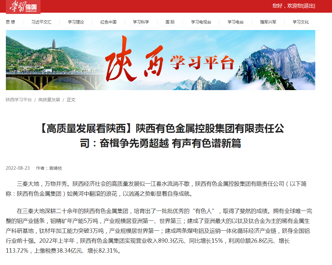 在三秦大地深耕二十余年的陜西有色金屬集團,培育出了一批批優(yōu)秀的“有色人”,他們通過辛勤勞動和創(chuàng)新智慧,在國家改革開放政策的指引下,堅持與時俱進、深化改革和持續(xù)發(fā)展,弘揚“讓資源更有價值”的“聚”文化理念,取得了斐然的成績。擁有全球唯一完整的鉬產業(yè)鏈條,鉬精礦年產能5萬噸,產業(yè)規(guī)模居亞洲第一、世界第三;建成了亞洲最大的以鈦及鈦合金為主的稀有金屬生產科研基地,鈦材年加工能力突破3萬噸,產業(yè)規(guī)模居世界第一;建成兩條煤電鋁及運銷一體化循環(huán)經濟產業(yè)鏈,躋身全國鋁行業(yè)前十強。數(shù)字是最好的證明: 2022年上半年,陜西有色金屬集團實現(xiàn)營業(yè)收入890.3億元、同比增長15%,利潤總額26.8億元、增長113.72%,上繳稅費38.34億元、增長82.31%。