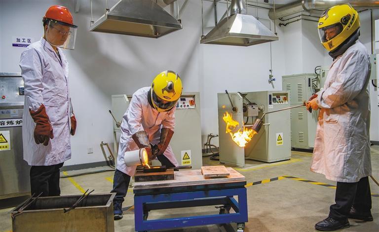 11月11日,在陜西黃金集團(tuán)西安秦金有限責(zé)任公司熔煉車間,員工正在制作黃金產(chǎn)品。據(jù)悉,今年前10月,該公司實(shí)現(xiàn)營業(yè)收入20.07億元。本報(bào)記者 袁景智攝