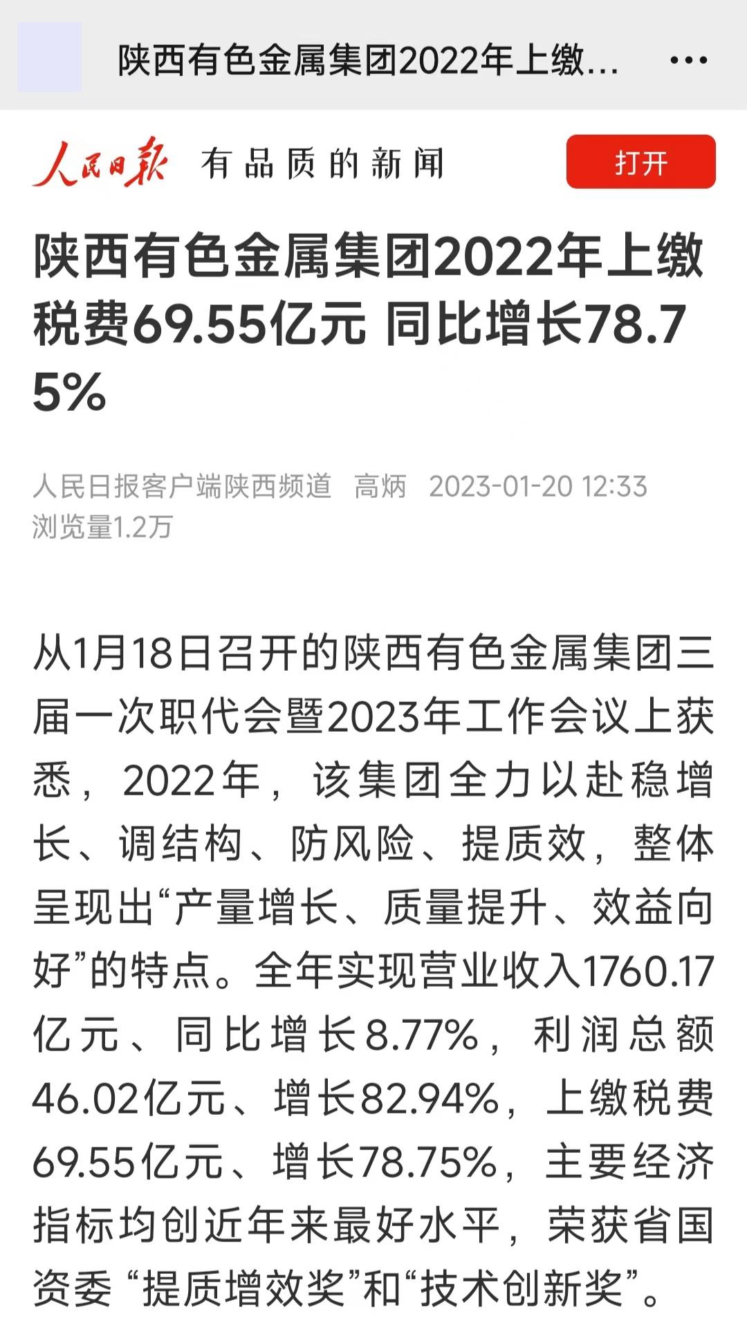 從1月18日召開的陜西有色金屬集團三屆一次職代會暨2023年工作會議上獲悉,2022年,該集團全力以赴穩(wěn)增長、調(diào)結(jié)構(gòu)、防風(fēng)險、提質(zhì)效,整體呈現(xiàn)出“產(chǎn)量增長、質(zhì)量提升、效益向好”的特點。全年實現(xiàn)營業(yè)收入1760.17億元、同比增長8.77%,利潤總額46.02億元、增長82.94%,上繳稅費69.55億元、增長78.75%,主要經(jīng)濟指標(biāo)均創(chuàng)近年來最好水平,榮獲省國資委 “提質(zhì)增效獎”和“技術(shù)創(chuàng)新獎”。