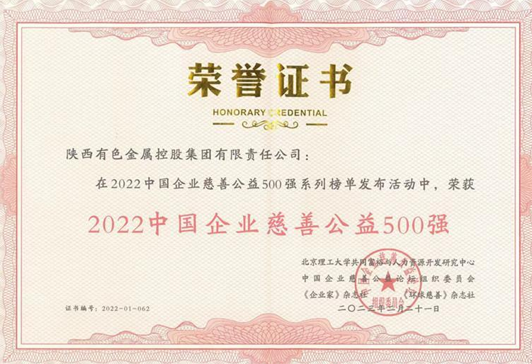 近日,2022中國企業(yè)慈善公益500強(qiáng)發(fā)布暨第六屆中國企業(yè)慈善公益論壇在重慶涪陵舉行,陜西有色金屬集團(tuán)榮獲“2022中國企業(yè)慈善公益500強(qiáng)”榮譽(yù)稱號。