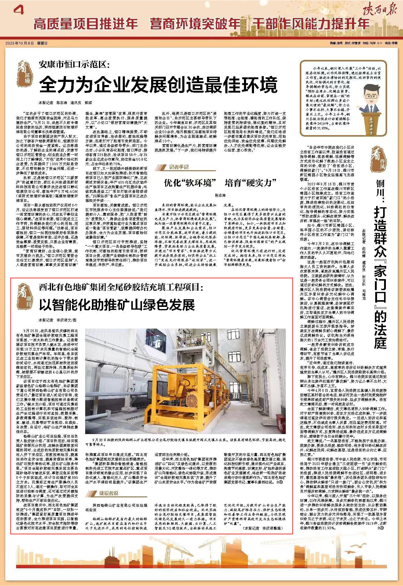 《陜西日?qǐng)?bào)》10月8日訊:9月25日,在鳳縣留鳳關(guān)鎮(zhèn)的西北有色地礦集團(tuán)全尾砂膠結(jié)充填工程項(xiàng)目現(xiàn)場,一派火熱的工作景象。記者跟隨該項(xiàng)目技術(shù)負(fù)責(zé)人樊水龍,走進(jìn)年可實(shí)現(xiàn)18萬立方米充填量的智能化全尾砂膠結(jié)充填生產(chǎn)車間。車間里,各系統(tǒng)正在工業(yè)控制計(jì)算機(jī)的指令下帶水聯(lián)動(dòng)試運(yùn)行,水流通過加壓泵被投送到深錐濃密機(jī),再經(jīng)過攪拌桶、充填泵給料箱,被源源不斷輸送到4公里以外的井下采空區(qū)。