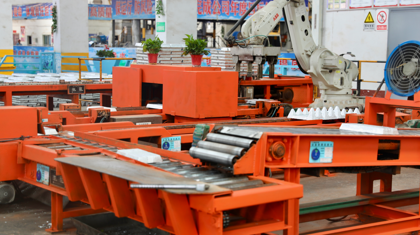 在生產(chǎn)現(xiàn)場(chǎng),一片片銀光閃閃的鋅錠隨著運(yùn)輸履帶緩緩運(yùn)行,場(chǎng)面十分壯觀。在熔鑄車間,火紅的熔爐散發(fā)出熾熱的氣息。經(jīng)過(guò)一系列復(fù)雜的工藝處理,最終制成一塊塊高質(zhì)量的鋅錠。