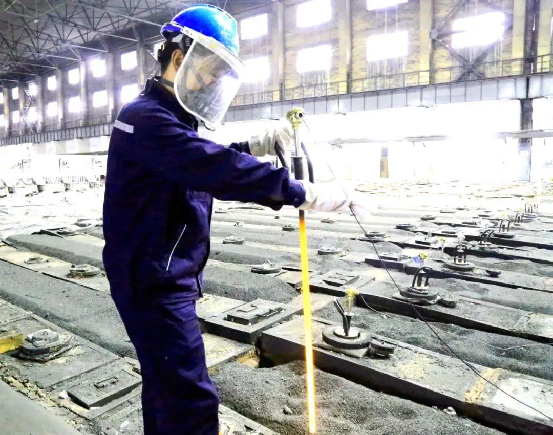 不管是早班還是晚班,我們這些熟練工基本都是滿負(fù)荷作業(yè),更不用說(shuō)新人?!蓖鯊堈f(shuō)。跟隨王彥龍走進(jìn)車間,此時(shí)電解槽旁的溫度更是高達(dá)60℃以上。在一頓繁雜的操作后,王彥龍指揮天車將殘極提了起來(lái),撈塊、扒沉淀……整個(gè)作業(yè)持續(xù)了30分鐘左右。