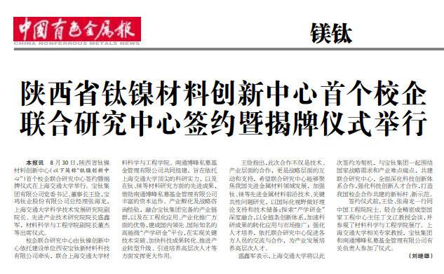 8月30日,陜西省鈦鎳材料創(chuàng)新中心(以下簡稱“鈦鎳創(chuàng)新中心”)首個校企聯(lián)合研究中心簽約暨揭牌儀式在上海交通大學(xué)舉行。寶鈦集團有限公司黨委書記、董事長王儉,寶雞鈦業(yè)股份有限公司總經(jīng)理張海龍,上海交通大學(xué)科學(xué)技術(shù)發(fā)展研究院副院長、先進產(chǎn)業(yè)技術(shù)研究院院長盛鑫軍,材料科學(xué)與工程學(xué)院副院長董杰等出席儀式