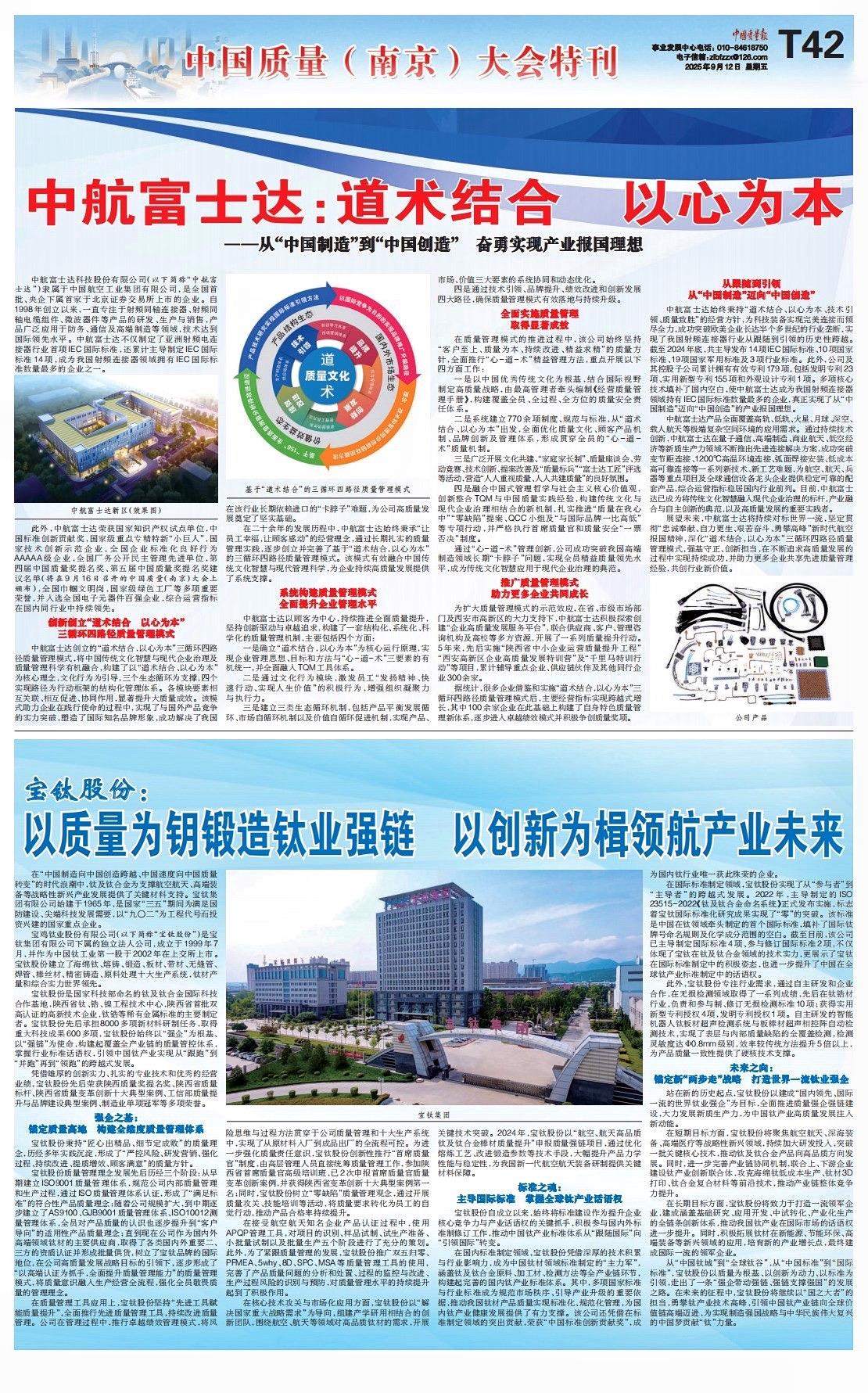 9月16日,中國質(zhì)量大會在江蘇省南京市正式開幕?!吨袊|(zhì)量報》推出的大會特刊,以《以質(zhì)量為鑰鍛造鈦業(yè)強鏈 以創(chuàng)新為楫領(lǐng)航產(chǎn)業(yè)未來》為題,對寶鈦股份近年來質(zhì)量強企強鏈工作進行了深度報道。