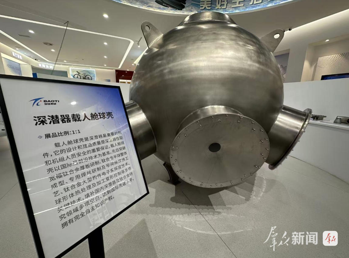 9月23日,走進寶鈦集團,展覽館內(nèi)碩大的深潛器載人艙球殼模型將時間線拉回5年前。2020年11月,裝有寶鈦研制生產(chǎn)的鈦合金載人球艙的“奮斗號”載人潛水器在馬里亞納海溝成功坐底10909米,創(chuàng)造我國載人深潛的新紀錄。
