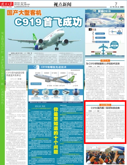 5月5日,國產(chǎn)商用大飛機(jī)C919成功首飛,寶鈦集團(tuán)有限公司作為國產(chǎn)大飛機(jī)國內(nèi)唯一鈦材料供應(yīng)商,備受矚目。