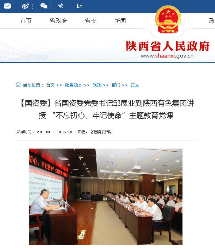 8月1日下午,根據(jù)中央、省委和省國資委黨委“不忘初心、牢記使命”主題教育部署,省國資委黨委書記鄒展業(yè)到陜西有色集團,以《悟初心、守初心、踐初心,以一流黨建推動省屬企業(yè)高質(zhì)量發(fā)展》為題給黨員領(lǐng)導(dǎo)干部上了一堂內(nèi)涵深刻、生動精彩的專題黨課。陜西有色集團黨委書記、董事長馬寶平主持黨課。
