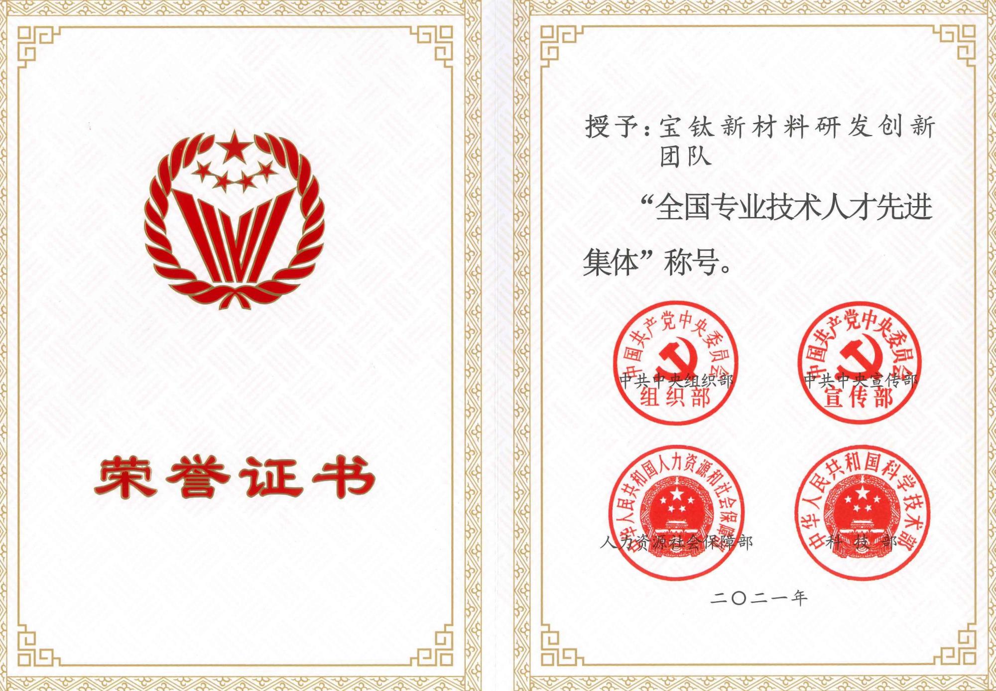 全國杰出專業(yè)技術(shù)人才及集體評選表彰由中共中央組織部、中共中央宣傳部、人力資源社會保障部、科技部聯(lián)合組織實施,每5年開展一次。此次獲得表彰的全國專業(yè)技術(shù)人才先進集體同時有鐘南山呼吸疾病防控團隊、殲-15飛機研制團隊等杰出人才集體,均為我國廣大專業(yè)技術(shù)人才的優(yōu)秀代表。2021年5月,在省人社廳、省國資委大力支持下,由陜西有色金屬集團組織申報,寶鈦新材料研發(fā)創(chuàng)新團隊與全省眾多優(yōu)秀企業(yè)科研團隊同臺競爭,經(jīng)過艱苦努力,沖出重圍,取得代表全省企業(yè)參與國家評選的唯一名額,最終在國家四部委聯(lián)合評選中脫穎而出。