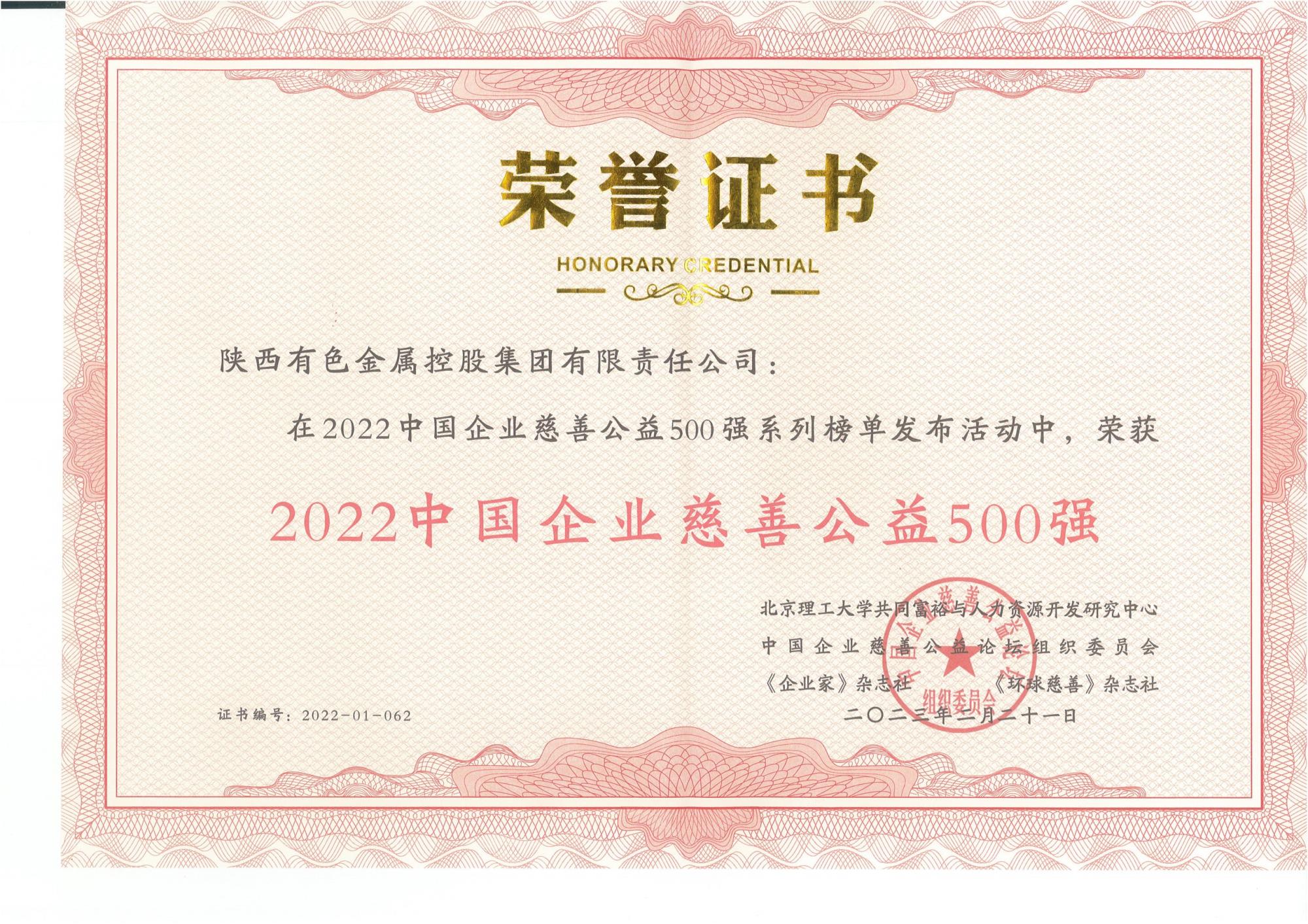 近日,2022中國企業(yè)慈善公益500強發(fā)布暨第六屆中國企業(yè)慈善公益論壇在重慶涪陵舉行,陜西有色金屬集團榮獲“2022中國企業(yè)慈善公益500強”稱號。