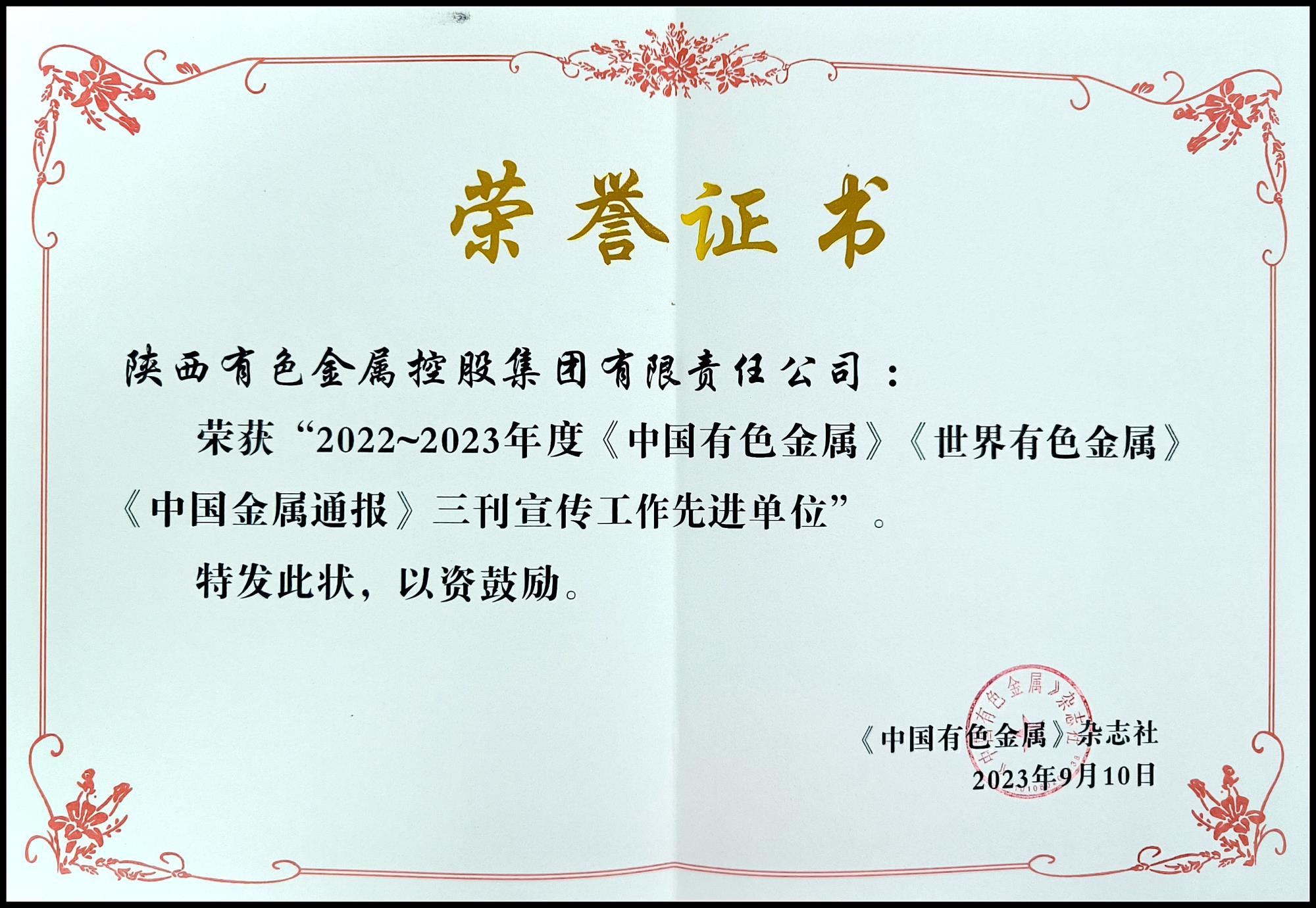 9月21日至22日,2023年《中國(guó)有色金屬》《世界有色金屬》《中國(guó)金屬通報(bào)》三刊特約通訊員、《中國(guó)有色金屬工業(yè)年鑒》撰稿人工作會(huì)在烏魯木齊市召開。會(huì)議表彰了2022—2023年度宣傳工作先進(jìn)單位,陜西有色金屬集團(tuán)被《中國(guó)有色金屬》雜志社評(píng)為“宣傳工作先進(jìn)單位”。