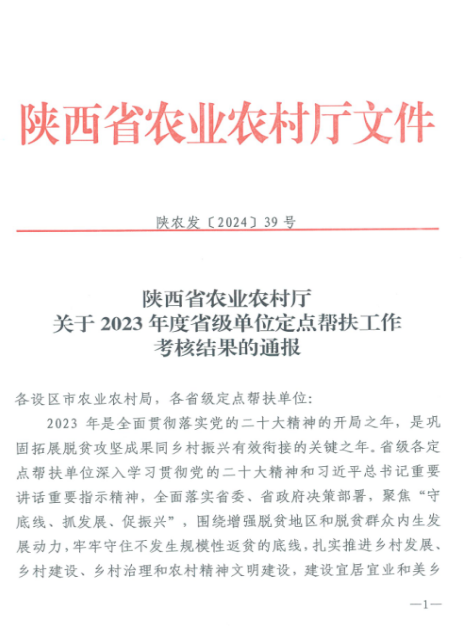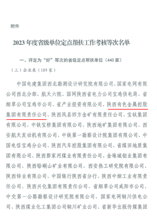 近日,陜西省農(nóng)業(yè)農(nóng)村廳印發(fā)《關(guān)于2023年度省級單位定點幫扶工作考核結(jié)果的通報》(陜農(nóng)發(fā)〔2024〕39號),對2023年度全省定點幫扶工作考核結(jié)果進行通報,陜西有色金屬集團被評為省級定點幫扶“好”等次單位,在進入鞏固脫貧攻堅成果同鄉(xiāng)村振興有效銜接期連續(xù)三年獲此殊榮。