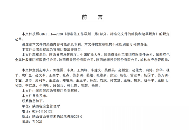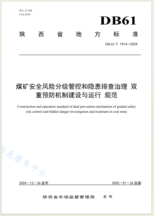 近日,陜西省發(fā)布《煤礦安全風(fēng)險分級管控和隱患排查治理雙重預(yù)防機(jī)制建設(shè)與運(yùn)行規(guī)范》(DB61/T 1914-2024),并于2025年1月26日正式實(shí)施,由陜西省應(yīng)急管理廳、中國礦業(yè)大學(xué)安全科學(xué)與應(yīng)急管理研究院、陜西有色金屬控股集團(tuán)有限責(zé)任公司等單位共同起草完成。