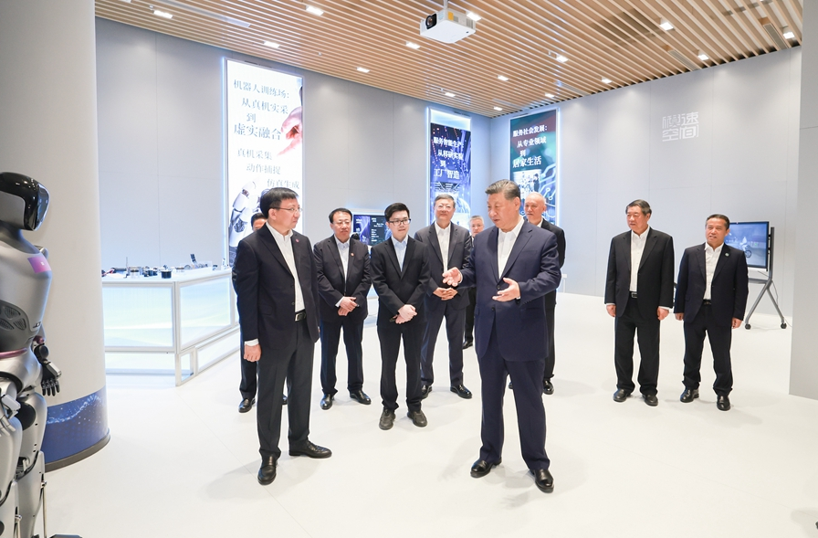 4月29日,中共中央總書記、國家主席、中央軍委主席習(xí)近平在上海考察。這是習(xí)近平在位于徐匯區(qū)的上?!澳K倏臻g”大模型創(chuàng)新生態(tài)社區(qū)人工智能產(chǎn)品體驗店考察。新華社記者 謝環(huán)馳 攝
