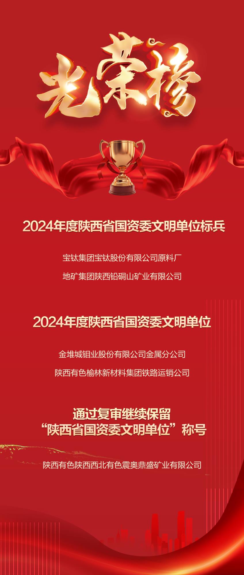 2024年度陜西省國資委文明單位標兵共31戶,其中省屬企業(yè)19戶、駐陜央企12戶;2024年度陜西省國資委文明單位共51戶,其中省屬企業(yè)33戶、駐陜央企18戶。寶鈦集團寶鈦股份有限公司原料廠、地礦集團陜西鉛硐山礦業(yè)有限公司2戶企業(yè)榮獲“2024年度陜西省國資委文明單位標兵”稱號;金堆城鉬業(yè)股份有限公司金屬分公司、陜西有色榆林新材料集團鐵路運銷公司2戶企業(yè)榮獲“2024年度陜西省國資委文明單位”稱號;陜西有色陜西西北有色震奧鼎盛礦業(yè)有限公司通過復審繼續(xù)保留“陜西省國資委文明單位”稱號。