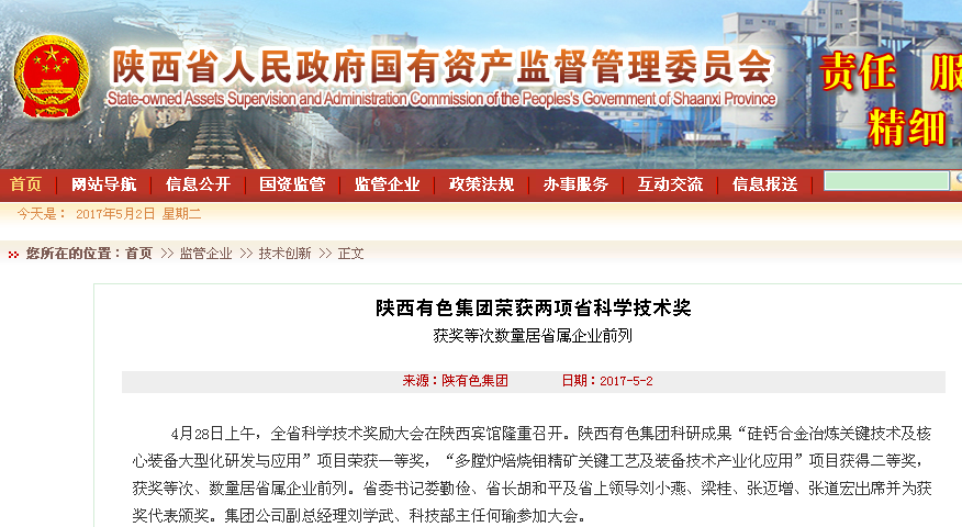 4月28日,記者從陜西有色集團(tuán)獲悉,該集團(tuán)公司科研成果“硅鈣合金冶煉關(guān)鍵技術(shù)及核心裝備大型化研發(fā)與應(yīng)用”項(xiàng)目、“多膛爐焙燒鉬精礦關(guān)鍵工藝及裝備技術(shù)產(chǎn)業(yè)化應(yīng)用”項(xiàng)目,分別獲得陜西省科學(xué)技術(shù)一等獎(jiǎng)和二等獎(jiǎng)。