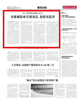 近日,從金堆城鉬業(yè)股份有限公司2017年度董事會(huì)工作報(bào)告獲悉,該公司2017年實(shí)現(xiàn)營(yíng)業(yè)總收入102.06億元,完成年度經(jīng)營(yíng)計(jì)劃目標(biāo)的 102.06%,同比增加4105.67萬元,增幅為 0.40%;實(shí)現(xiàn)利潤(rùn)總額1.34億元,同比增加 5369.87萬元,增幅為66.57%;實(shí)現(xiàn)歸屬于母公司股東的凈利潤(rùn)1.07億元,同比增加5337.60萬元,增幅為99.03%。較2016年相比,經(jīng)營(yíng)業(yè)績(jī)大幅增加。
