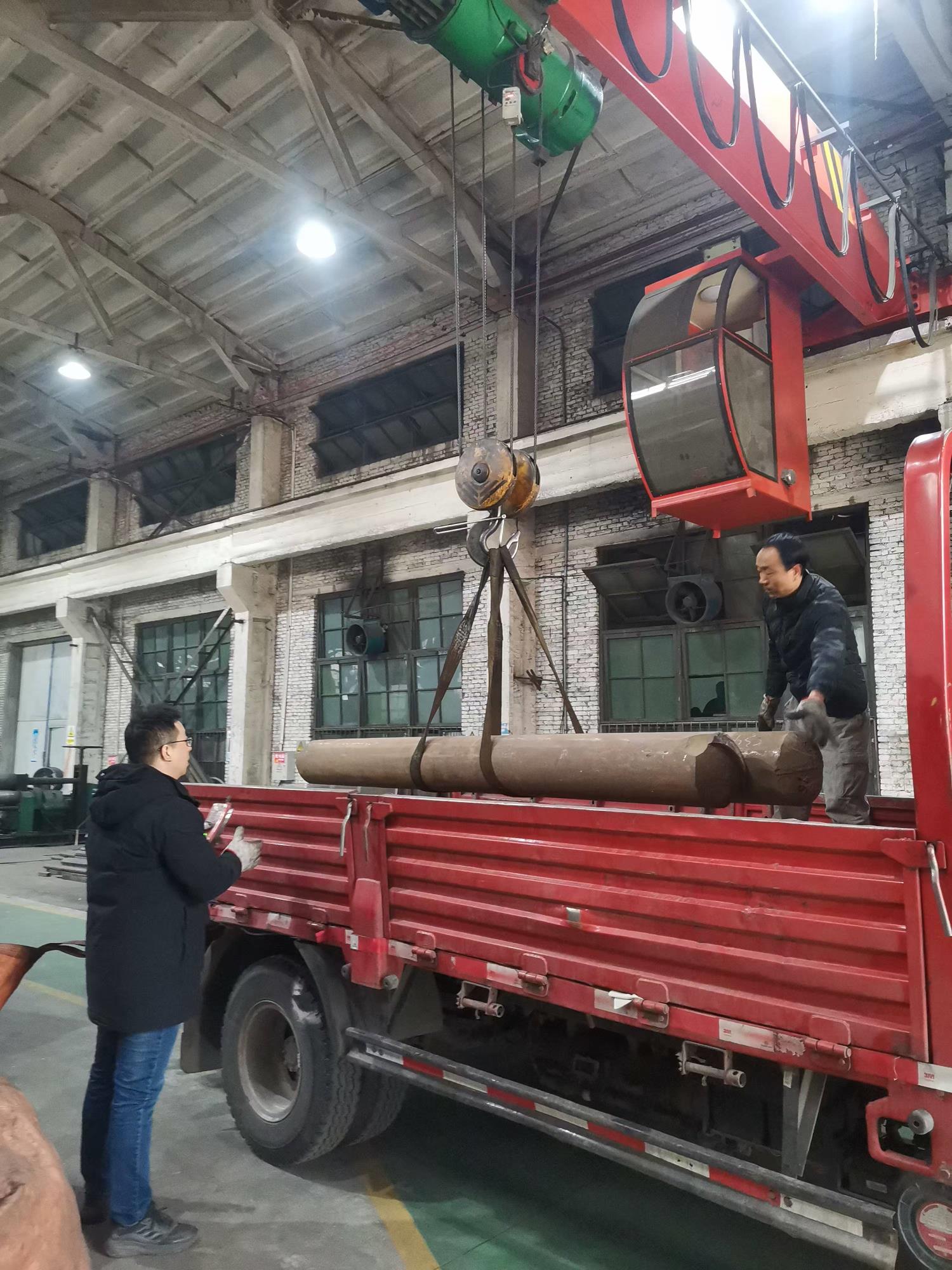 2月1日(正月初四),機(jī)械院金工車間調(diào)度金煒與司機(jī)惠海龍吊裝鈦棒。