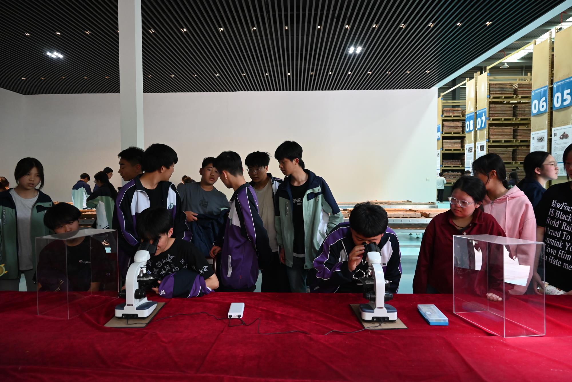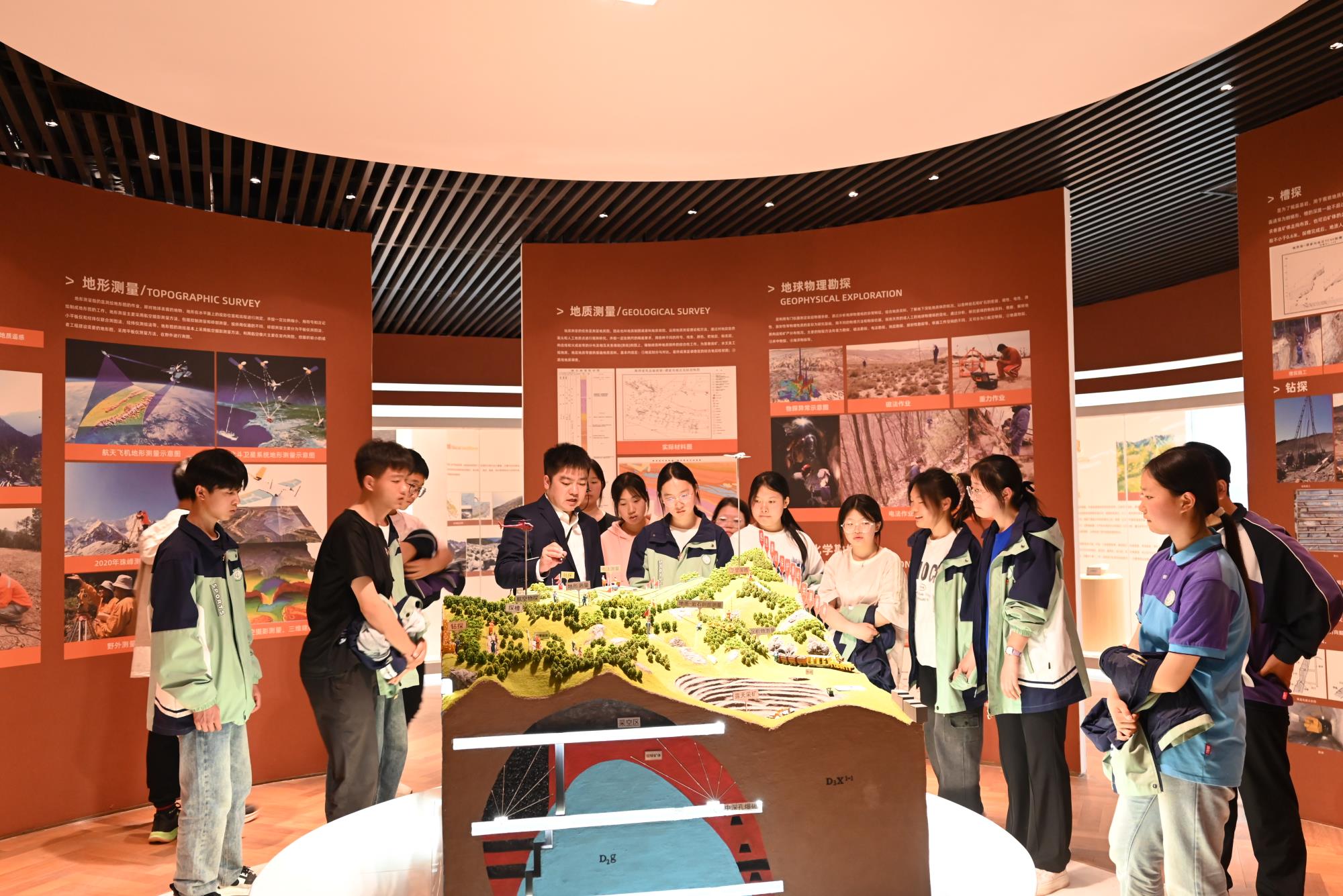 這座由地礦集團(tuán)精心籌劃并投資修建的地質(zhì)殿堂,猶如一把穿越時(shí)空的鑰匙,打開(kāi)了孩子們通往神秘地質(zhì)世界的大門(mén)。在寶藏世界展區(qū),講解員生動(dòng)地介紹了板塊運(yùn)動(dòng)塑造復(fù)雜地質(zhì)構(gòu)造的原理,并通過(guò)沙盤(pán)模型清晰地展示了秦嶺地區(qū)的山脈、峽谷和盆地的形成過(guò)程。礦產(chǎn)資源展區(qū)則化身自然寶庫(kù),同學(xué)們認(rèn)真聆聽(tīng)了講解員對(duì)礦石種類(lèi)、特征、用途及秦嶺地區(qū)礦產(chǎn)資源分布規(guī)律和形成原因的講解,還通過(guò)電子顯微鏡探秘礦石的微觀世界,依據(jù)顏色、光澤、形狀等特征來(lái)判斷礦石種類(lèi),在方寸之間觸摸大地的脈動(dòng)。