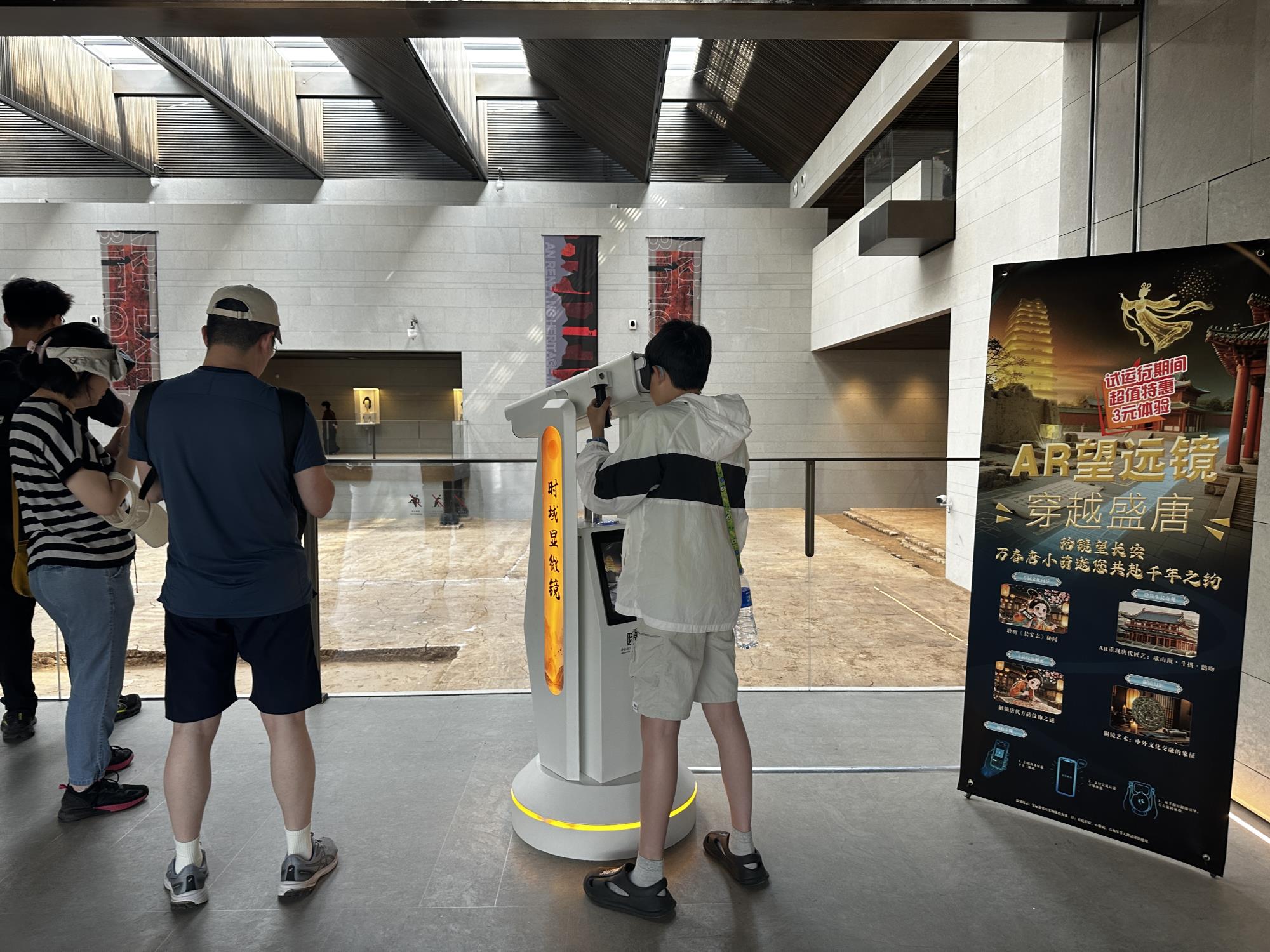在場館內(nèi)遺址展示區(qū),游客只需通過手機(jī)掃碼,便可在“AI唐小萌”的帶領(lǐng)下暢游無阻,輕松獲取豐富的展品資料及其背后的歷史故事。游客手持AR望遠(yuǎn)鏡,對準(zhǔn)遺址標(biāo)識,蓮花方磚、銅鏡等文物的復(fù)原展示及科普講解便會躍然眼前。俯瞰下方遺址,古老的唐代建筑遺跡與現(xiàn)代化的AR復(fù)原影像交相輝映,方寸之間盡顯盛唐之美。