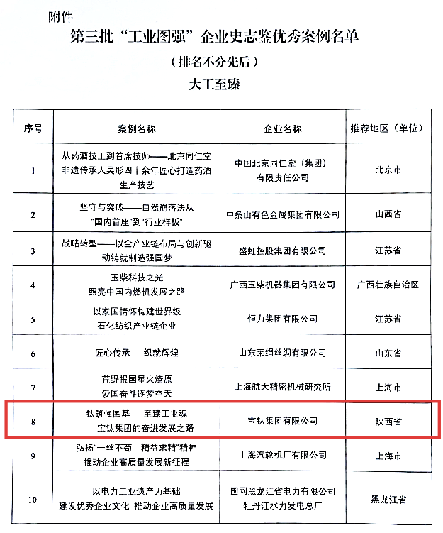近日,寶鈦集團成功入選工信部工業(yè)文化發(fā)展中心第三批“工業(yè)圖強”企業(yè)史志鑒優(yōu)秀案例名單。