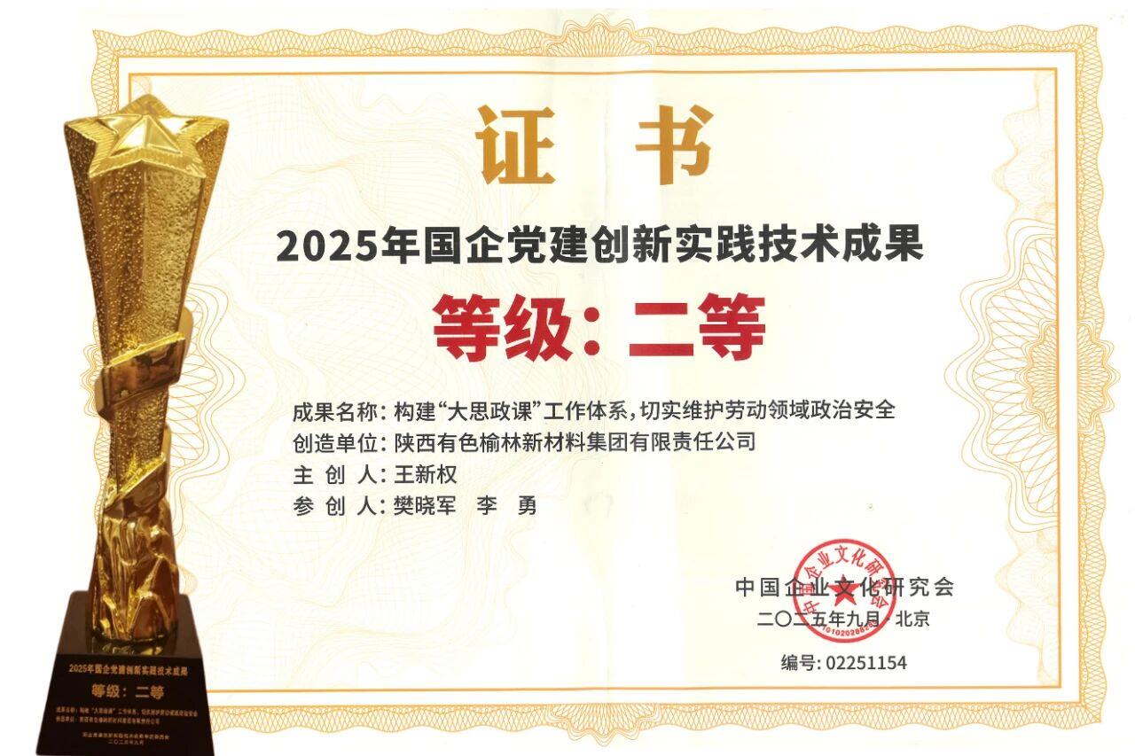 近日,2025年國企黨建創(chuàng)新實踐交流會在北京召開。會上,公布了“2025年國企黨建創(chuàng)新實踐技術成果”評選結果。榆林新材料集團黨委申報的黨建創(chuàng)新成果《構建“大思政課”工作體系,切實維護勞動領域政治安全》憑借突出的創(chuàng)建成效,獲評“2025年國企黨建創(chuàng)新實踐技術成果”第二等級。