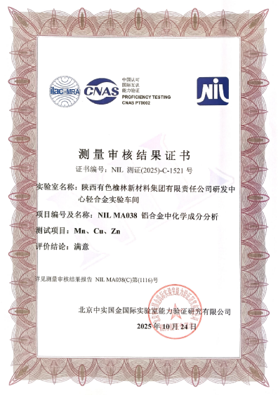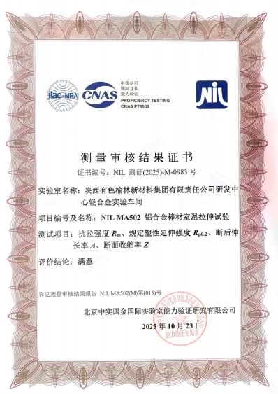 近日,榆林新材料集團(tuán)研發(fā)中心鋁合金中化學(xué)成分分析、鋁合金棒材室溫拉伸測(cè)定、粉末粒度分析(激光衍射法)測(cè)定三個(gè)項(xiàng)目順利通過(guò)國(guó)家CNAS實(shí)驗(yàn)室測(cè)量審核能力驗(yàn)證,評(píng)價(jià)結(jié)果均為“滿(mǎn)意”,并獲得能力驗(yàn)證證書(shū),證明其檢測(cè)技術(shù)能力已符合中國(guó)合格評(píng)定國(guó)家認(rèn)可委員會(huì)(CNAS)實(shí)驗(yàn)室認(rèn)可要求。