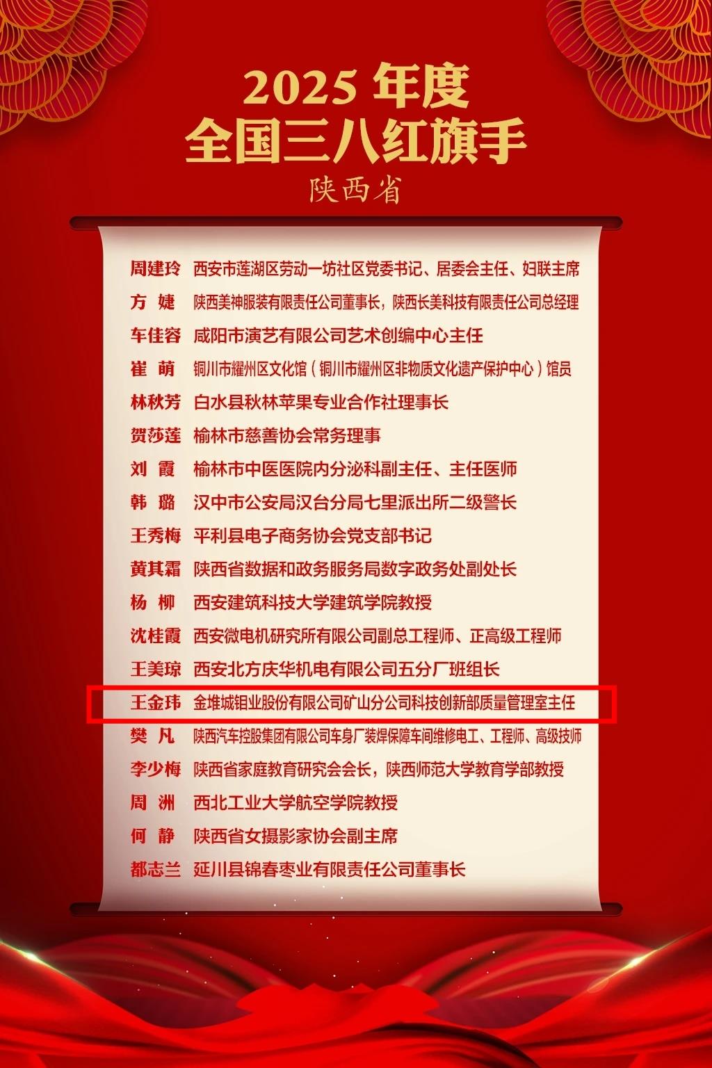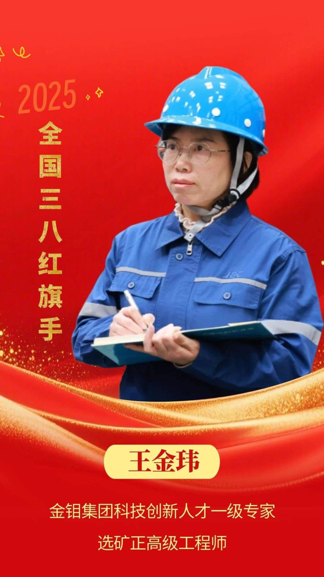 3月2日,中華全國婦女聯(lián)合會發(fā)布2025年度全國三八紅旗手標兵、全國三八紅旗手、全國三八紅旗集體、全國巾幗文明崗名單,陜西省共有19名個人和12個集體獲2025年度全國三八紅旗手和全國三八紅旗集體表彰。金鉬集團科技創(chuàng)新人才一級專家、選礦正高級工程師王金瑋被授予“全國三八紅旗手”稱號。