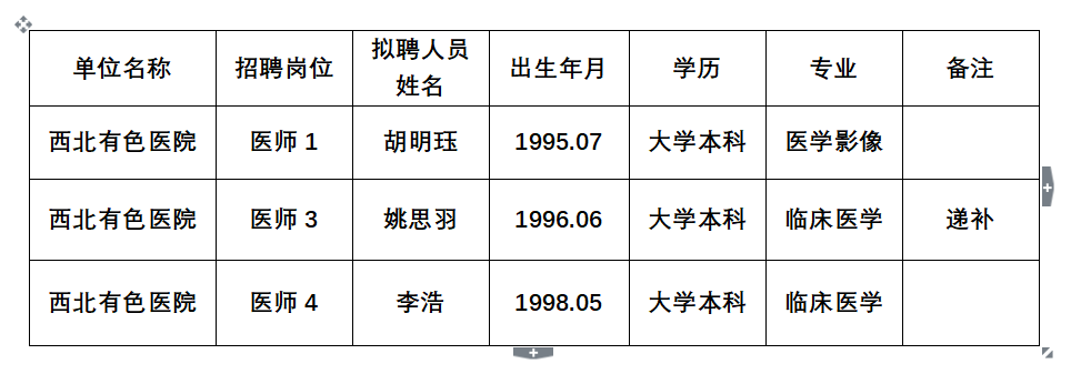西北有色醫(yī)院2021年省屬事業(yè)單位公開招聘體檢、考察環(huán)節(jié)已經(jīng)結(jié)束,依據(jù)《事業(yè)單位人事管理條例》《陜西省事業(yè)單位公開招聘工作人員實施辦法》及2021年陜西省省屬事業(yè)單位公開招聘工作人員公告要求,現(xiàn)將西北有色醫(yī)院擬聘人員名單公示如下: