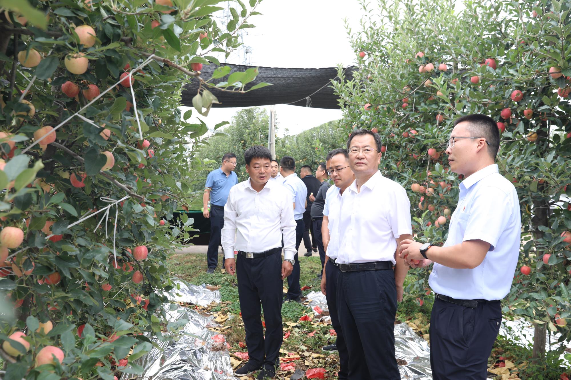 隨后,嚴(yán)平一行走進(jìn)早熟蘋果產(chǎn)業(yè)基地。紅彤彤的果實(shí)掛滿枝頭,果園飄香,一派豐收景象?,F(xiàn)場(chǎng)品嘗后,嚴(yán)平對(duì)口感脆甜的果實(shí)贊不絕口,并詳細(xì)詢問了果園規(guī)格、農(nóng)戶收入等,鼓勵(lì)駐村干部繼續(xù)幫助農(nóng)戶推進(jìn)創(chuàng)新、強(qiáng)化品牌建設(shè),助力鄉(xiāng)村產(chǎn)業(yè)升級(jí)。同時(shí)還觀摩了無人機(jī)自動(dòng)噴灑作業(yè)演示,進(jìn)一步了解了現(xiàn)代化種植生產(chǎn)情況。