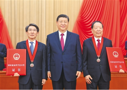儀式號角響起,習(xí)近平首先向獲得2023年度國家最高科學(xué)技術(shù)獎的武漢大學(xué)李德仁院士和清華大學(xué)薛其坤院士頒發(fā)獎?wù)?、證書,同他們熱情握手表示祝賀。隨后,習(xí)近平等黨和國家領(lǐng)導(dǎo)人同兩位最高獎獲得者一道,為獲得國家自然科學(xué)獎、國家技術(shù)發(fā)明獎、國家科學(xué)技術(shù)進步獎和中華人民共和國國際科學(xué)技術(shù)合作獎的代表頒發(fā)證書。