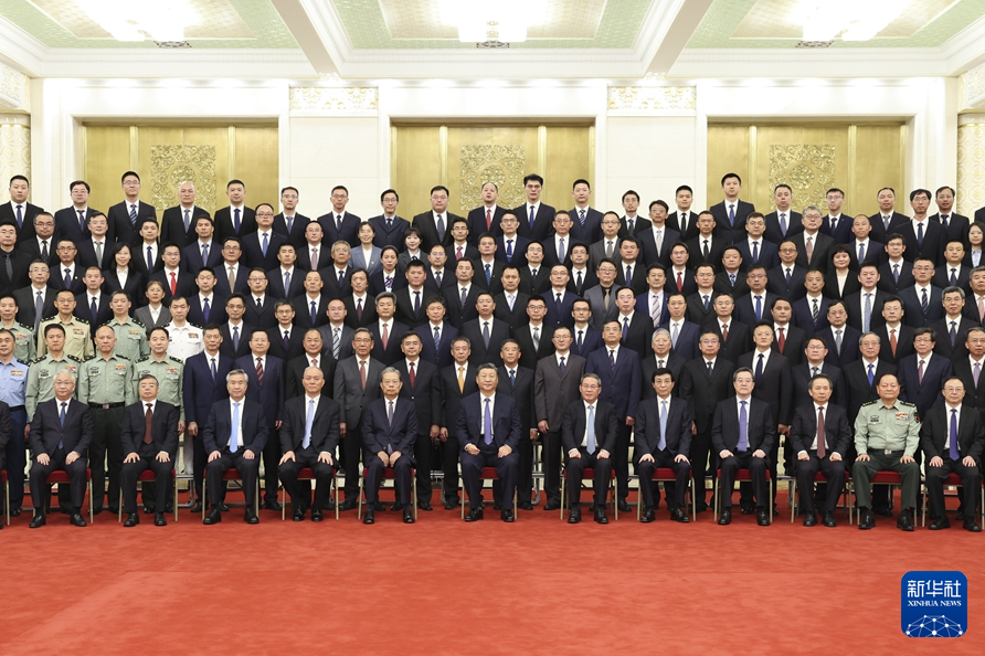 上午10時許,習近平等黨和國家領導人來到人民大會堂北大廳,全場響起長時間熱烈掌聲。習近平等同大家親切握手,并合影留念。