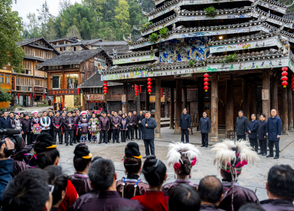 17日下午,習(xí)近平來(lái)到黔東南州黎平縣肇興侗寨考察。寨門(mén)口,身著民族盛裝的村民唱起侗族大歌歡迎總書(shū)記。習(xí)近平饒有興致地聽(tīng)取侗族大歌的藝術(shù)起源、曲調(diào)特點(diǎn)、演唱形式等方面介紹。隨后,沿著村寨路道察看侗寨風(fēng)貌和旅游商鋪,不時(shí)駐足與店主、游客、村民互動(dòng)交談。在侗族文化展示中心,他詳細(xì)了解侗族歷史、風(fēng)俗和服飾、建筑等特色文化保護(hù)傳承情況。在侗鄉(xiāng)特色產(chǎn)業(yè)基地,他觀看蠟染工藝流程,對(duì)蠟染合作社堅(jiān)持顧客至上、質(zhì)量第一的運(yùn)營(yíng)理念給予肯定。習(xí)近平指出,少數(shù)民族文化是中華文化不可或缺的組成部分,既要保護(hù)有形的村落、民居、特色建筑風(fēng)貌,傳承無(wú)形的非物質(zhì)文化遺產(chǎn),又要推動(dòng)其創(chuàng)造性轉(zhuǎn)化、創(chuàng)新性發(fā)展,讓民族特色在利用中更加鮮亮,不斷煥發(fā)新的光彩。