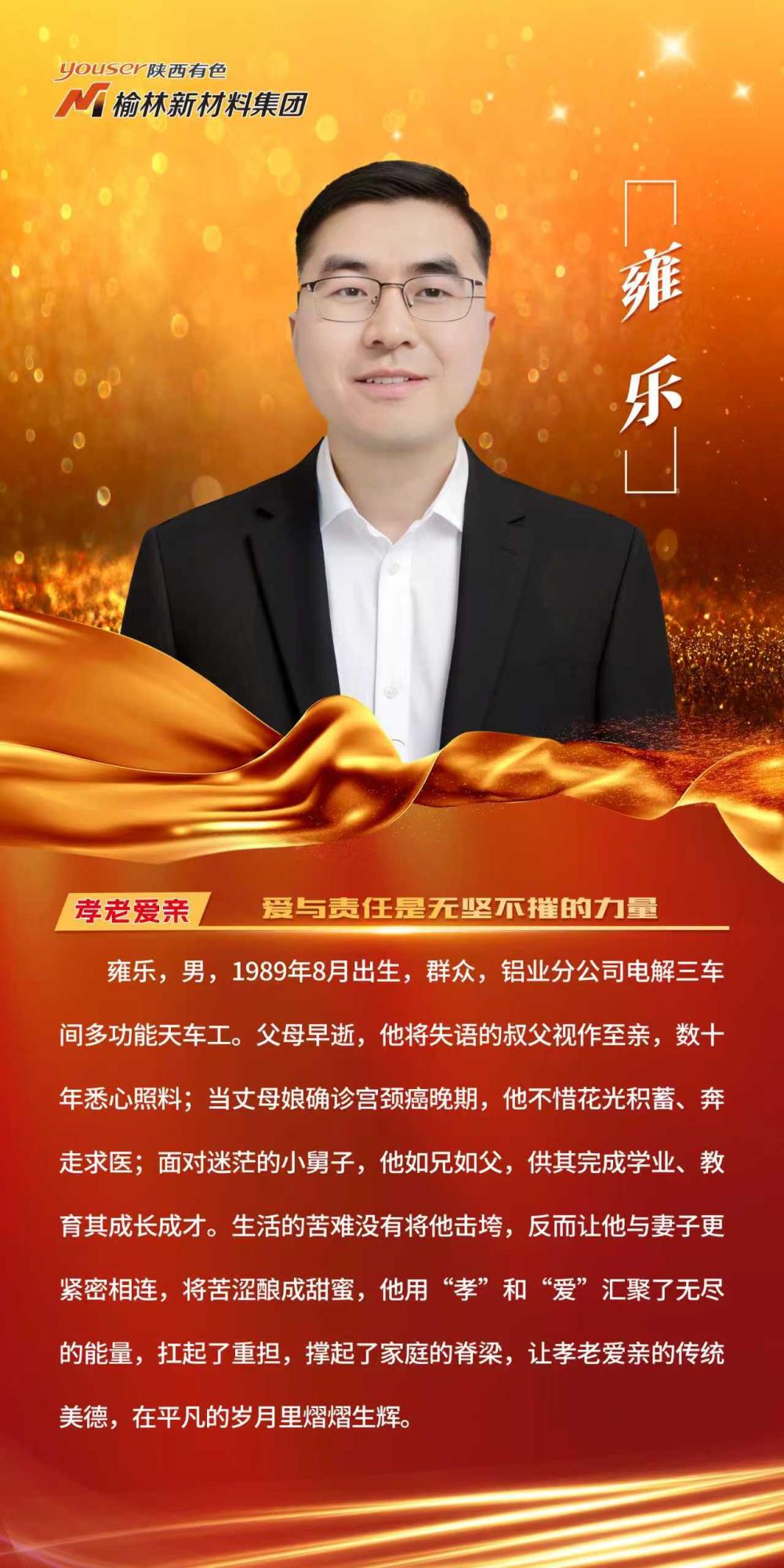 發(fā)布儀式上,榆林新材料集團(tuán)合金分公司鑄造車間鑄造工曹孝孝被授予“助人為樂好人”;鋁業(yè)分公司凈化供料車間檢修電工吳俊龍被授予“敬業(yè)奉獻(xiàn)好人”;鋁業(yè)分公司電解三車間多功能天車工雍樂被授予“孝老愛親好人”;鋁業(yè)分公司供電車間高壓運(yùn)行工段秀麗被授予“自強(qiáng)勵(lì)志好人”。