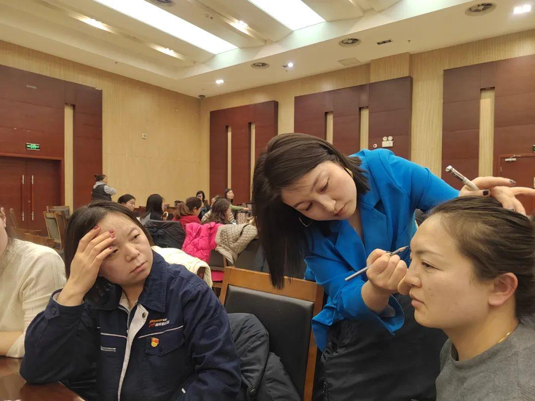 化妝師結(jié)合多媒體圖片從服裝色彩搭配、儀容儀表、護(hù)膚知識、化妝工具的使用方法、化妝品的選擇、彩妝技巧等專業(yè)知識進(jìn)行了細(xì)致梳理和正確引導(dǎo),并對現(xiàn)場女工的儀容儀表作了現(xiàn)場分析,結(jié)合她們不同的發(fā)色、衣著、氣質(zhì),提出了一些化妝變美的建議,使得女工在規(guī)避誤區(qū)的同時(shí)共享了美麗的秘密。