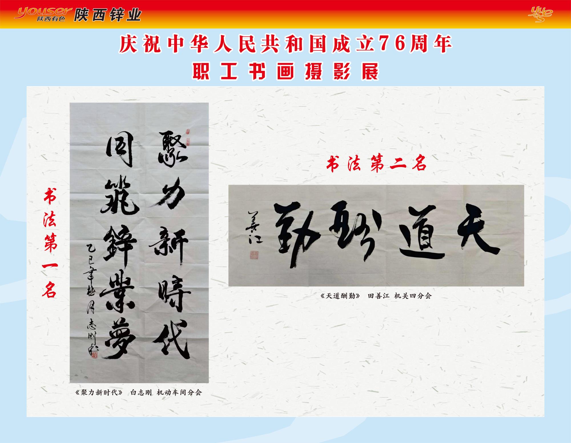 書法類:一等獎機(jī)動車間分會《聚力新時代》;二等獎機(jī)關(guān)四分會《天道酬勤》;三等獎鋅粉車間分會《勞動最光榮》。