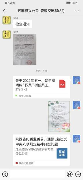 節(jié)前有部署。一是結(jié)合陜西銀礦實(shí)際,及時(shí)印發(fā)《關(guān)于做好五一端午期間糾治“四風(fēng)”工作的通知》,對(duì)節(jié)日期間糾治“四風(fēng)”工作進(jìn)行合理安排部署。二是通過(guò)公司官網(wǎng)、微信公眾號(hào)、工作群等網(wǎng)絡(luò)媒介,做好廉潔提醒宣傳,暢通舉報(bào)渠道,通報(bào)違反中央八項(xiàng)規(guī)定精神典型案例,筑牢黨員干部作風(fēng)防線,嚴(yán)防死守杜絕“節(jié)日腐敗”。三是對(duì)公司資產(chǎn)財(cái)務(wù)部、黨群工作部、辦公室等重要部室負(fù)責(zé)人進(jìn)行節(jié)前廉潔提醒,要求嚴(yán)格履行崗位職責(zé),認(rèn)真貫徹執(zhí)行中央八項(xiàng)規(guī)定精神,嚴(yán)禁節(jié)假日期間違規(guī)收送禮品和宴請(qǐng)、違規(guī)使用公款吃喝旅游、公車(chē)私用等違規(guī)違紀(jì)行為的發(fā)生,時(shí)刻注意言行舉止,樹(shù)立良好的黨員干部形象。嚴(yán)格落實(shí)疫情防控各項(xiàng)措施,切實(shí)做好疫情防控工作,全方位做好節(jié)日期間糾治"四風(fēng)"工作。