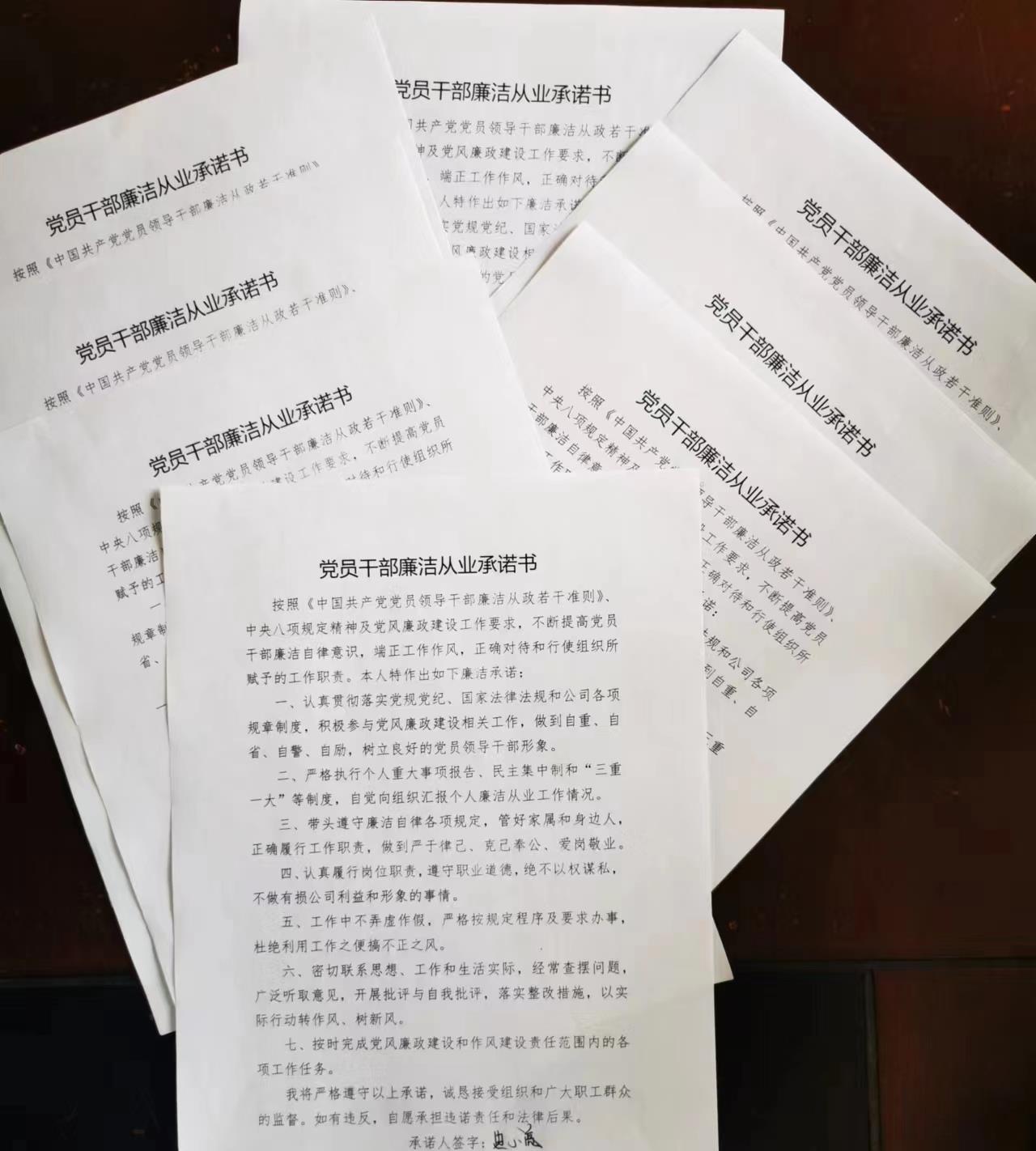 廉潔承諾求真務(wù)實。按照全面從嚴治黨要求,結(jié)合《國有企業(yè)領(lǐng)導(dǎo)人員廉潔從業(yè)若干規(guī)定》,黨支部圍繞中央八項規(guī)定精神、“七字”作風(fēng)建設(shè)、公司規(guī)章制度和崗位職業(yè)操守等內(nèi)容編制《廉潔從業(yè)承諾書》,從生活作風(fēng)和工作作風(fēng)兩個層面,進一步規(guī)范黨員干部的行為準(zhǔn)則。通過深入開展踐諾承諾活動,黨員干部的紀(jì)律意識、廉潔意識和責(zé)任意識顯著增強。