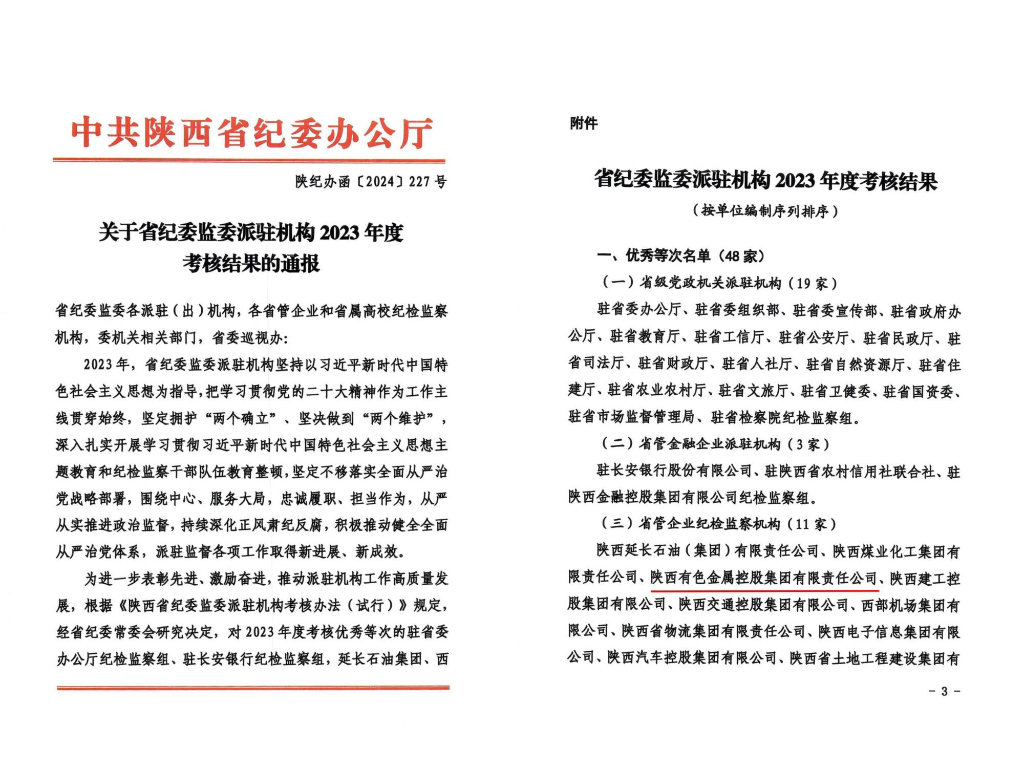 日前,陜西省紀(jì)委辦公廳印發(fā)《關(guān)于省紀(jì)委監(jiān)委派駐機(jī)構(gòu)2023年度考核結(jié)果的通報(bào)》,陜西有色金屬集團(tuán)紀(jì)委在33家省管企業(yè)紀(jì)檢監(jiān)察機(jī)構(gòu)考核中獲評(píng)優(yōu)秀等次。這是集團(tuán)公司紀(jì)委連續(xù)第四年獲評(píng)省紀(jì)委監(jiān)委派駐機(jī)構(gòu)考核優(yōu)秀等次,體現(xiàn)了省紀(jì)委監(jiān)委對(duì)集團(tuán)公司紀(jì)檢監(jiān)察工作的充分肯定和鼓勵(lì)鞭策。